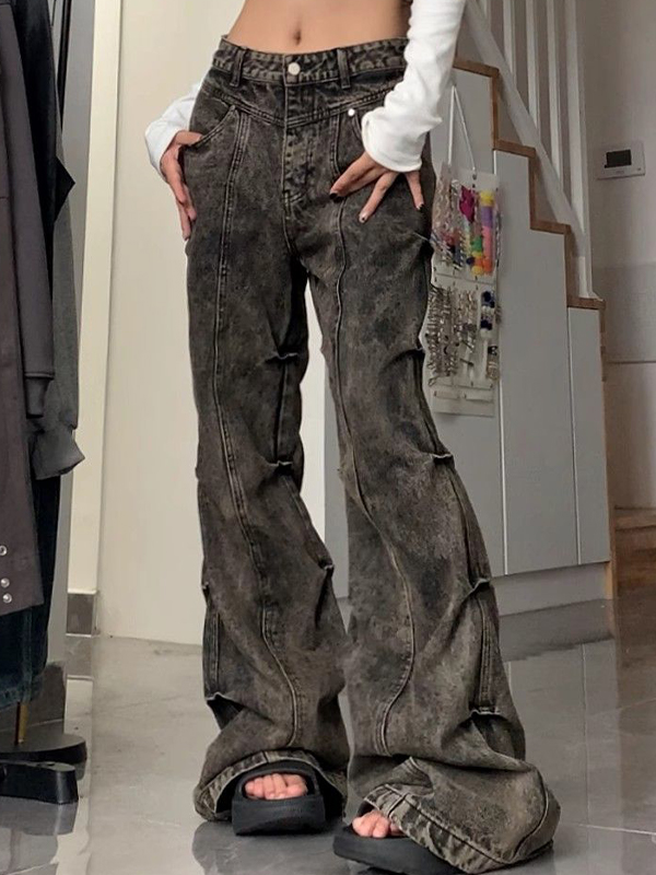 Wasteland Style Washed Pleats Slightly Flared Flare Jeans