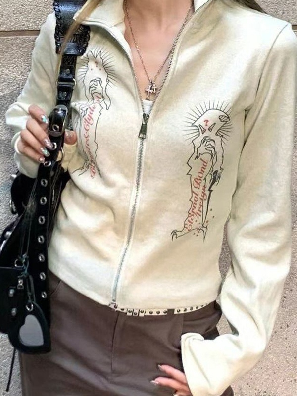Vintage Print Lapel Neck Zip Up Long Sleeve Knit