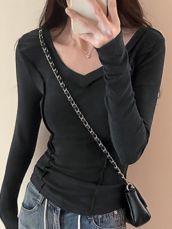 Solid V Neck Seam Detail Slim Long Sleeve Knit