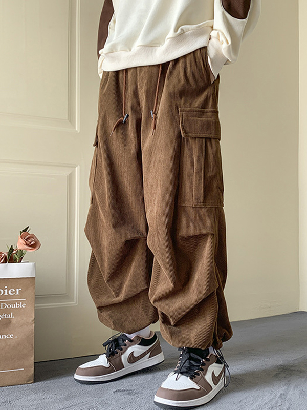 Men’s Corduroy Big Pocket Bound Feet Drawstring Cargo Pants
