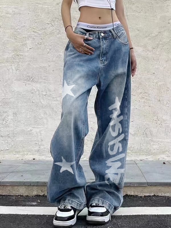 Washed Star Letter Print Boyfriend Jeans