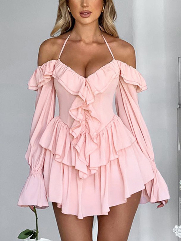 Solid Halter Ruffled Trim Mini Dress