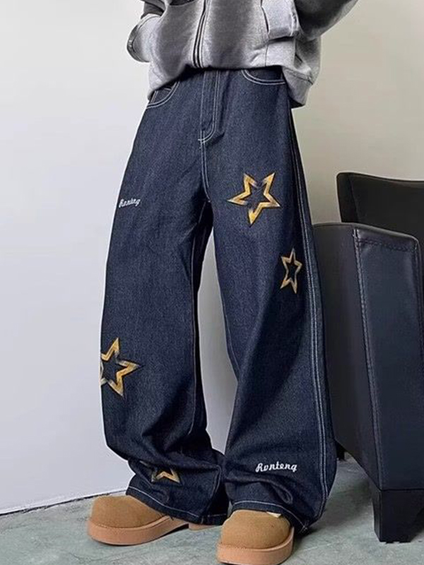 Men’s Distressed Interesting Flower Embroidery Loose Jeans