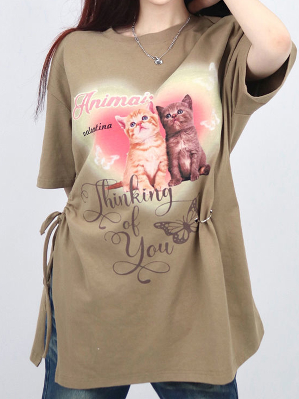 Cat Print Drawstring Oversized Short Sleeve Tee