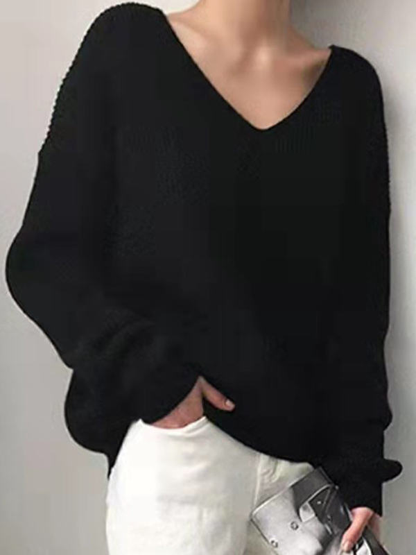 Solid V Neck Irregular Hem Baggy Knit Sweater