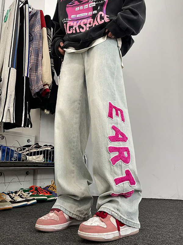 Contrast Letter Flocking Embroidery High Rise Boyfriend Jeans