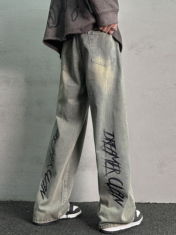 Vintage Yellow Mud Letter Loose Straight Jeans