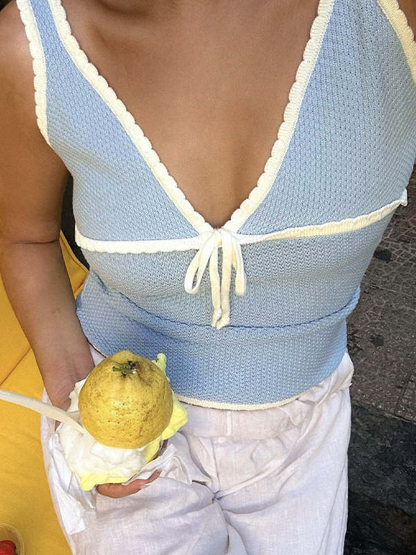 Contrast Color Stitching V Neck Bow Tank Top