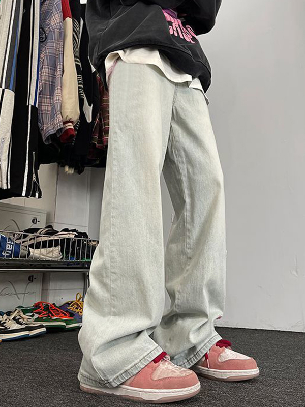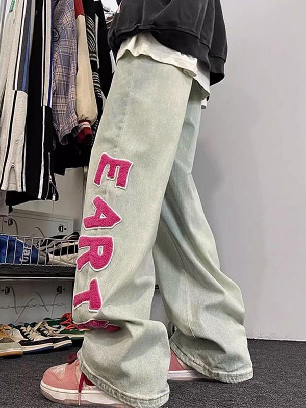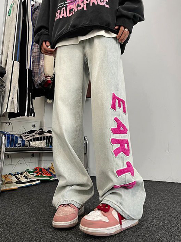 Contrast Letter Flocking Embroidery High Rise Boyfriend Jeans