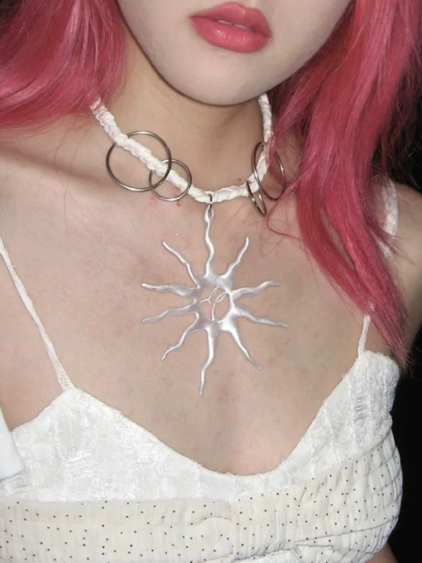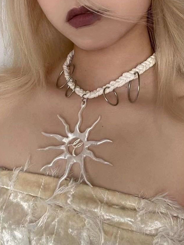 Cutout Sun Pendant Metal Ring Rope Necklace