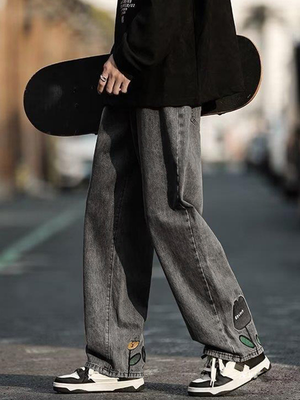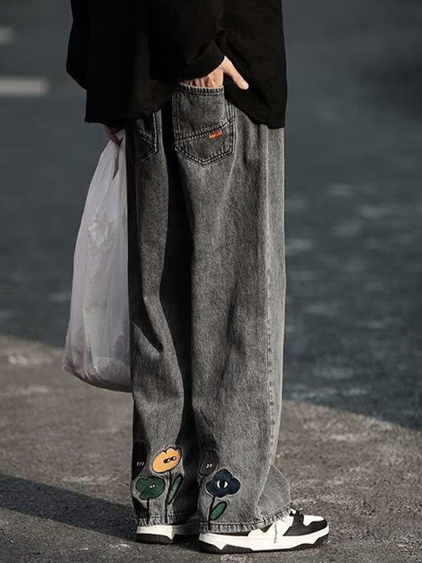 Men’s Distressed Interesting Flower Embroidery Loose Jeans