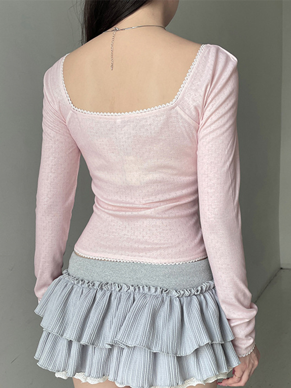 Solid Color Square Neck Bow Slim Long Sleeves Knits