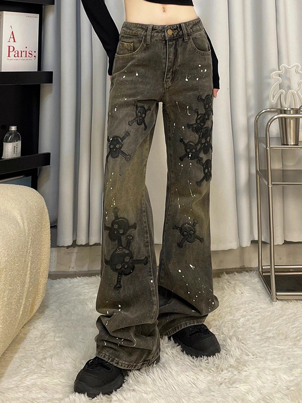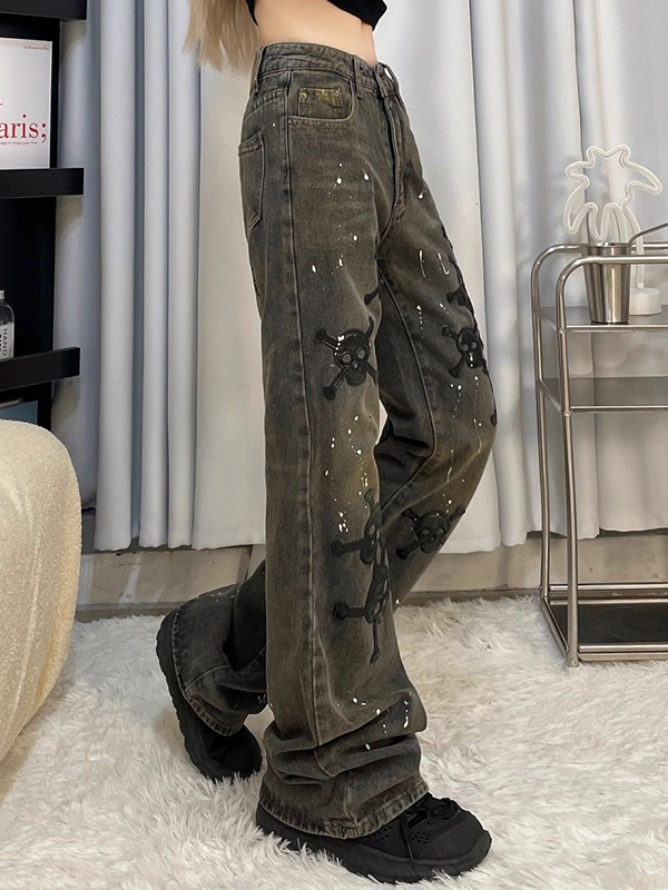 Splashed Ink Skull Embroidery On Leather Boyfriend Jeans