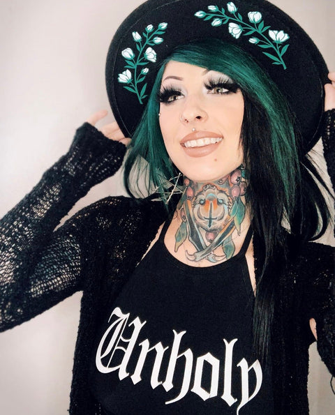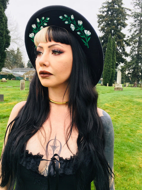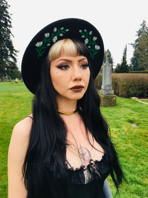 Sombrero vegano de fieltro con ala ancha y estampado floral blanco.