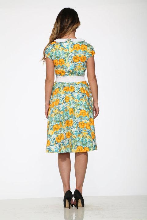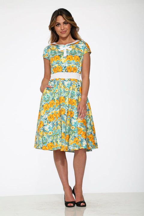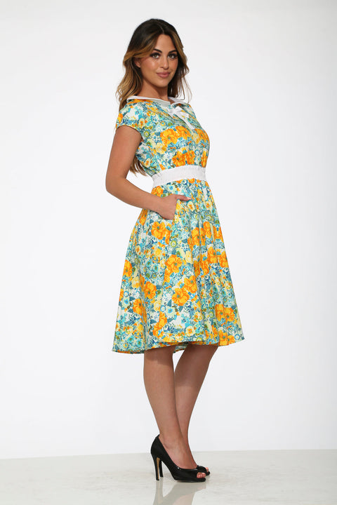 Vestido amarillo con estampado floral estilo swing